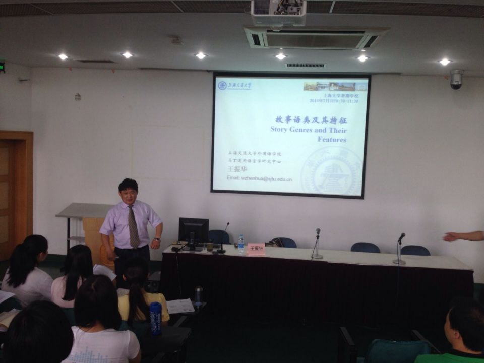 在上午9点整,王振华教授开始了题为"故事语类及其特征"的讲座。他在系统功能学范式下,依照语类理论,介绍不同的故事种类,分析不同的故事文本,讨论不同故事语类的特征。本次讲座所涉及的故事语类主要有详述、轶事、劝喻、观察/评论、叙事和新闻。讨论的语类特征主要有语类结构/评价资源等。在王教授的讲座中,各种内容都以图片形式清晰地展现在同学们眼前。王教授还旁征博引,介绍了如genre、stage、phase等相关术语。本堂课虽然内容很多,但是前后错落有致,联系紧密。王教授在课堂上引用的几个故事,典型有趣,外加王教授生动逼真的演说,员工们都被深深的吸引。