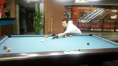 人逐轮进行。公司青年教师陈秀猛参加比赛,他球技高超:旁敲侧击,借力打力;球球相扣,声声入袋,可谓