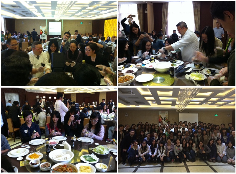 在具有中式特色的餐厅里,柔和的黄色灯光下数十个圆桌坐满了宾客,洁白的瓷盘上摆放着颗颗饱满的白米饭,粉嫩的午餐肉,绿油油的黄瓜,微微淡黄的蛋黄酱等等各类食材,色彩繁多让人食欲大开。这是在做什么呢?原来在此次交流会上,龟甲万株式会社特别邀请了日本料理大师柿泽一氏先生为现场近百名日语系师生及特邀的日本职工带来一场别开生面的日本料理讲座。