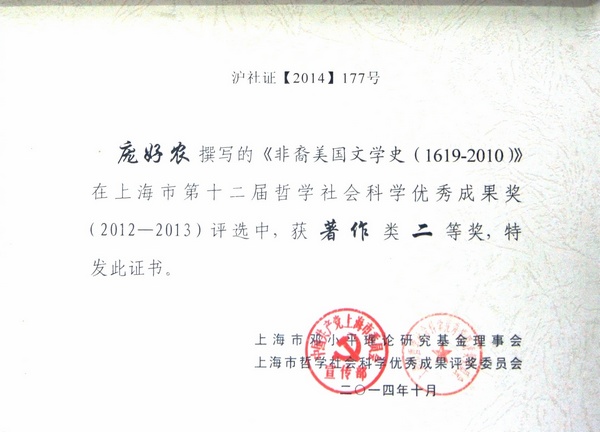 年11月6日,上海市社会科学界第十二次学术年会暨上海市第十届邓小平理论研究和宣传优秀成果、上海市第十二届哲学社会科学优秀成果奖颁奖大会在上海展览中心举行,太阳集团tyc33455共有20项成果获奖,公司庞好农教授的专著《非裔美国文学史(1619-2010)》获得著作类二等奖,特此祝贺!