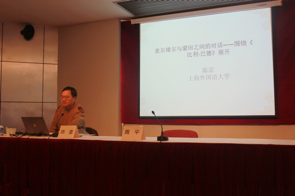 2014年12月19日上午,第六届太阳成集团tyc33455学术节在宝山校区行政楼报告厅如期举行,学院领导以及广大教师代表、专业研究生们共同迎来了公司一年一度的学术盛宴。来自上海外国语大学文学研究院的教授陈雷博士受邀出席并发表了以"麦尔维尔与蒙田之间的对话--以《比利·巴德》为例"为题目的报告。陈雷教授认为,美国19世纪作家麦尔维尔的作品主题与法国文艺复兴后期人文主义思想家蒙田的怀疑论观点存在着一定的互文性,并借助麦的小说《比利·巴德》中三个主要人物展开了关于人性中"恶"之本质的探讨。他从古典理论出发,指出正义与非正义,也即善恶之分体现为对于等级秩序的遵循或颠覆,进而引申到蒙田思想中"恶"来源于人的理性内部,是一种堕落腐败的理性。陈雷教授最后总结道,关注人性之"恶"在当下仍然有深刻的启示意义,人们不能滥用和放纵理性的欲望;自然状态下的人应是理性与感性的结合、力与美的结合。报告结束后,陈雷教授与在座的师生进行了精彩的问答互动。