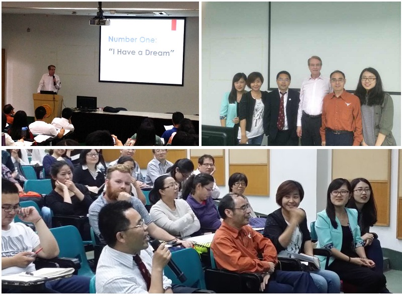 Lucas教授以马丁.路德.金的著名演讲"我有一个梦想"的视频为例带着在场师生重温了美国民权运动史上那振聋发聩的呼声、震撼人心的时刻。听众们仿佛穿越了时空回到了半个多世纪前,成为了现场20多万听众中的一员,深深地沉浸在马丁.路德.金那铿锵有力、直指人心的精彩演讲之中。之后,Lucas教授逐一分析了上述七大要素在"我有一个梦想"演讲中的体现,阐述了"我有一个梦想"成为历史经典演讲的系列因素,指出演讲者鲜明的非裔美国人演讲风格并具体分析了种族平等的梦想如何通过排比、反复、比喻等修辞融入其演讲内容中赢得共鸣。最后,Lucas教授针对大家提出的英语演讲风格、文化介入、修辞分析等方面的问题,结合自己的经历,给予了耐心、细致的解答。Lucas教授谈到了全国英语演讲比赛中走出来的优秀赛手如何从自己的视角展现中国文化,并鼓励大家要重视自己的思辨能力、在演讲中善于展示自己的观点。