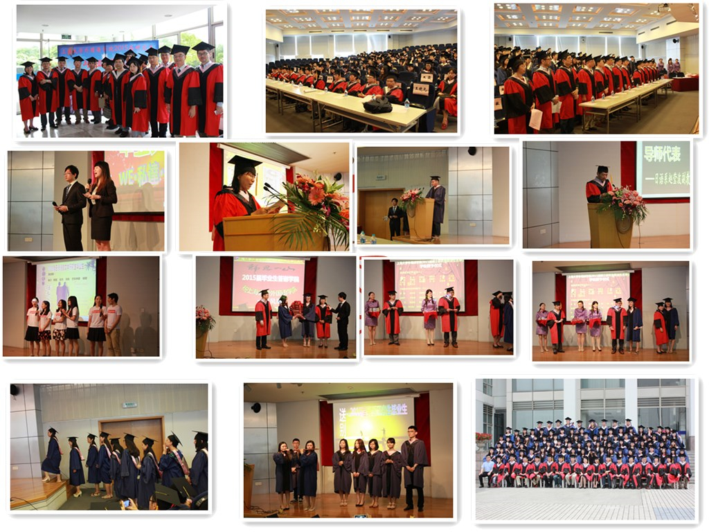 毕业典礼紧紧围绕主题"我们",给全体师生带来诸多喜悦和感动。开场视频《我们的足记》记录了2015届毕业生们往昔成长的点点滴滴;随后,周平经理寄语毕业生,希望大家怀揣质疑、探索精神,充实生活,实现梦想,她说:"毕业典礼并不是在庆祝结束,而是欢呼开始,大家一定要继续努力";2013级英语笔译研究生蔡军作为毕业生代表作了精彩发言,他表达了对母校、父母、导师、学院的感谢,他希望大家在踏入社会怀着社会责任的同时,能够在自我和社会间保持一种平衡,希望再度相遇时,彼此阅历的总和,能够构成繁华绚丽的世界;紧接着日语系赵莹波副教授作为导师代表上台发言,他坦言,若能重返校园,他要多去尝试以前不喜欢做的事情,"不喜欢是因为苦,而恰恰因为苦,才能有真收获",他希望大家在未来的生活和学习工作中都能勇于挑战短板,勇往直前。