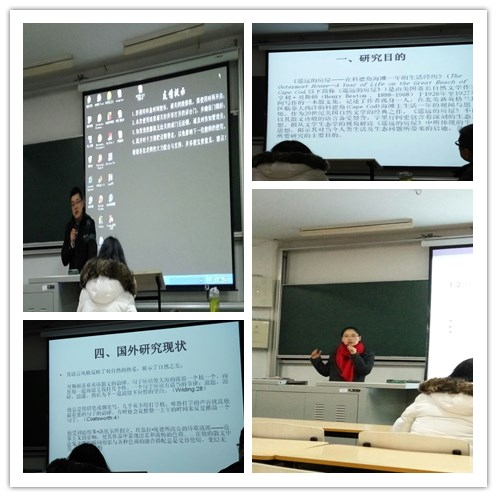 之后,2014级英语语言文学硕士研究生张航、程怡云,2014级外国语言学及应用语言学硕士研究生宋亚丽分别进行了开题示范。张航同学的论文是根据美国作家亨利·贝斯顿的著作《遥远的房屋》展开,其论文题目是《< 遥远的房屋>的文员工态学研究》,其开题报告从研究目的、研究意义、研究方法、国内外研究现状、研究框架、参考文献等方面进行了说明。程怡云同学的论文题目是《二战阴影下的反思与救赎——麦克·尤恩< 黑犬>之主题研究》,其论文从"黑犬"与历史暴力、人类文明的哲学思辨、历史的反思与文明的救赎等方面展开,她将深入分析麦克·尤恩对于战争阴影下人类文明该何去何从的探寻,与此同时以史为镜,在已有研究的基础上进一步挖掘该作品在现今依旧复杂的国际政治历史局势中的意义与启示。宋亚丽同学的论文题目是《政治话语的批评话语分析——以中国领导人在联合国的发言为例》,其开题报告介绍了论文引言、文献综述、理论框架、联合国安理会发言稿的批评话语分析、结论与启示、参考文献等。