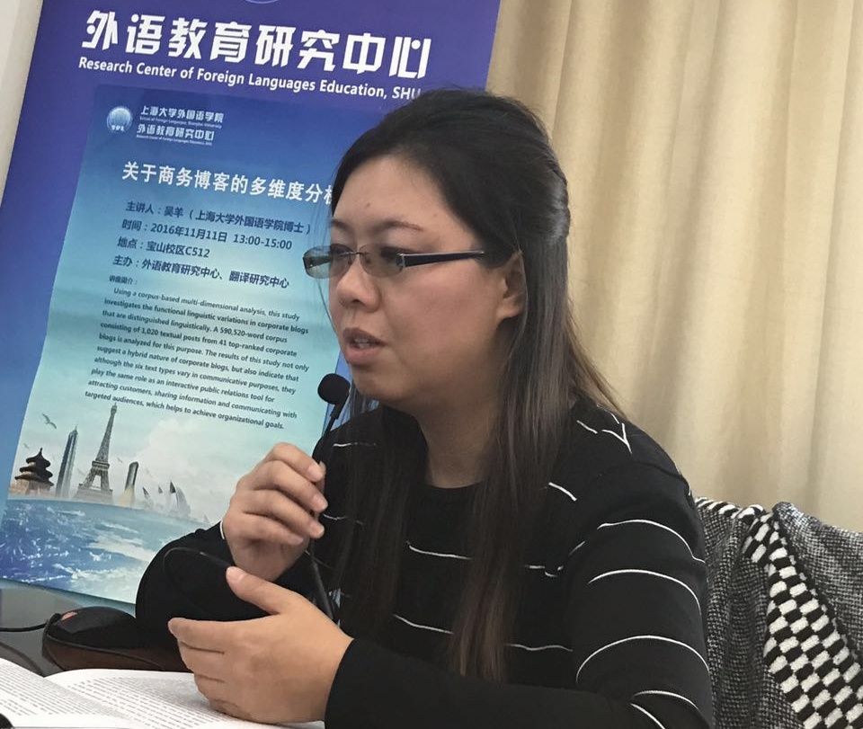 11月11日下午,太阳集团tyc33455外国语讲师吴羊博士应邀在太阳集团tyc33455宝山校区C512为外院师生做了题为《关于商务博客的多维度分析》的学术讲座。讲座由外语教育研究中心主任张新玲主持,来自外院和图情档的多位师生参加了讲座。
