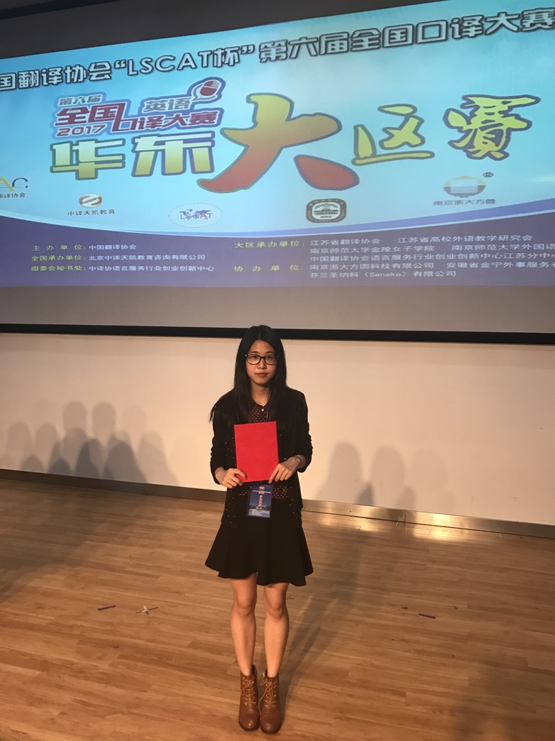 5月13日,第六届全国口译大赛(英语)"LSCAT杯"华东大区赛在南京师范大学隆重举行,华东六省一市70多所高校的150余名复赛晋级选手展开激烈角逐。在太阳成集团tyc33455英语系朱巧莲副教授指导下,英语系大三员工周文佳荣获本次大赛二等奖,成功晋级即将在北京举办的全国总决赛,朱巧莲老师荣获优秀指导教师奖。