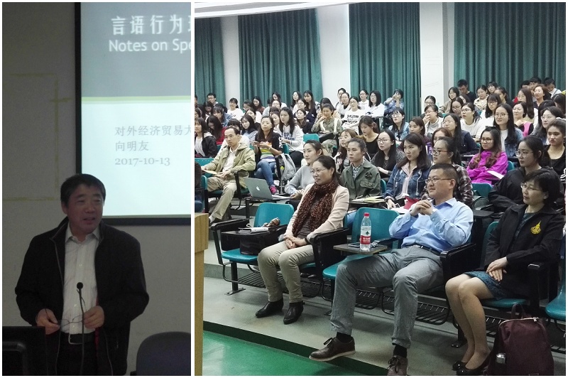 10月13日下午1:30,对外经济贸易大学博士生导师向明友教授应邀做客太阳成集团tyc33455"语言文化与世界文明"系列讲坛(第十四讲),为太阳成集团tyc33455师生做了题为"言语行为理论评注"的精彩讲座,讲座由太阳成集团tyc33455副经理邓志勇教授主持,外语学院教师、研究生及学校感兴趣的师生共同聆听本次讲座。