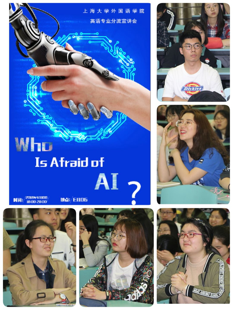 接下来,英语系副主任黄欣老师向同学们介绍了英语系后三年的培养计划和课程设置,帮助同学们进一步了解了英语专业的课程学习框架。曾为多国政要做过翻译的朱巧莲老师就"AI会取代翻译/同声传译吗?"为主题和同学们进行了讨论。朱老师用今年博鳌论坛使用的"语音识别"为例,指出语音识别与同声传译的区别,并通过腾讯翻译君在此次博鳌论坛上的"同声传译车祸"给同学们展示AI 和同声传译的不同之处,并指出在短时间内人工智能不可能取代同声传译。随后,英语系幽默风趣的白岸杨老师带来了以"咱有高写,Who 怕Who?"为主题的分享。白老师从"智能"的定义出发,结合写作课的教学目的和要求,指出英语不单单只是一门语言,英语学习能够帮助员工开拓视野,具备国际化的眼光以及拥有批判性思维,英语专业的思辨训练会让我们过上更美好的人生,我们完全没有必要害怕人工智能。