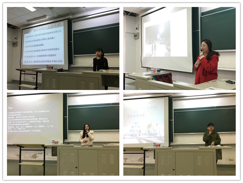 在"保研推免,并非高不可攀——2017年优秀直研员工心得交流"环节中,成功保研到华东师范大学对外汉语专业的张璐学姐与大家分享了"华师大圆梦之旅",她不仅为同学们梳理了保研相关流程及时间安排,还提醒学弟学妹一定要"多留意夏令营,赢在起跑线"、"多关注各学校推免时间"等注意事项。成功保研到上海外国语大学英语语言文学专业口译学方向、获得2015-2016学年国家奖学金的2014级英语系王舒雅学姐,与大家分享了自己三年多的奋斗历程。王舒雅同学牢记上海"自强不息,先天下之忧而忧、后天下之乐而乐"的校训,在学习上对自己严格要求、合理规划、与时间赛跑,在保研时积极向学长学姐请教经验,同时认真复习备考,最终成功以出色的表现赢得了自己心仪的"offer"。
